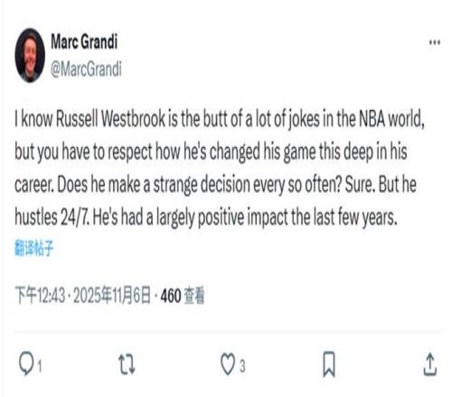 美記Marc Grandi則更加真誠(chéng)的表示:“我知道NBA世界中有很多人都會(huì)拿威少來(lái)開(kāi)玩笑,但你不得不佩服他在職業(yè)生涯后期如此出色地改變了自己的比賽方式,哪怕他偶爾會(huì)做出一些奇怪的決定,但他24小時(shí)永遠(yuǎn)保持拼搏,過(guò)去幾個(gè)賽季一直交出積極正向的表現(xiàn)?!?/p>