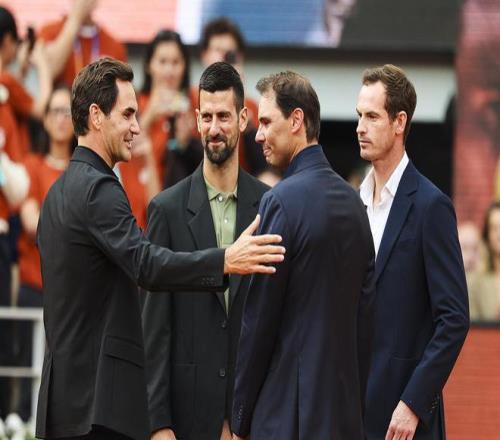 2025年5月25日,法網官方為納達爾舉行致敬儀式,費德勒、德約科維奇、穆雷到場祝賀。納達爾在法網賽事中告別。視覺中國 圖