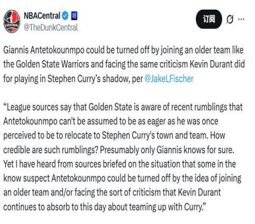 “聯(lián)盟消息人士透露,勇士方面已察覺到近期的一些流言:外界此前默認(rèn)字母哥會(huì)迫切渴望加入庫里所在的球隊(duì)、來到這座城市,但事實(shí)可能并非如此。這類流言的可信度究竟有多高?想必只有字母哥本人最清楚。不過,據(jù)知情人士透露,一些圈內(nèi)人猜測,字母哥或許會(huì)打退堂鼓 —— 一方面是因?yàn)橛率筷嚾菽挲g偏大,另一方面則是他不想落得和杜蘭特一樣的下場,至今仍因當(dāng)年聯(lián)手庫里而飽受詬病?!?/p>